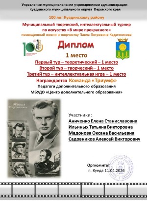 Команда педагогов «Триумф» — абсолютные победители муниципального турнира «В мире прекрасного» (категория «Педагоги») на тему «Жизнь и творчество Павла Петровича Кадочникова»!