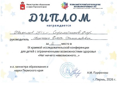 16 апреля состоялся финал IX краевой исследовательской конференции для детей с ограниченными возможностями здоровья «Нет ничего невозможного…». Этому значимому событию предшествовала большая и кропотливая работа, с которой блестяще справились Иванилов Артём и Сыромятников Егор.