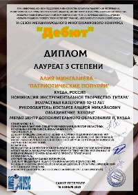 Поздравляем Мингалиеву Алию (объединение "Аккорд", педагог Костарев А. М.) с Дипломом лауреата 1 степени во в Международном конкурсе - фестивале искусств "Мозаика искусств".