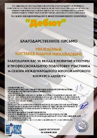 Поздравляем Алию Мингалиеву и Андрея Михайловича Костарева (объединение "Аккорд") с Дипломом лауреата 3 степени в 14 Международном многожанровом конкурсе "Дебют".
