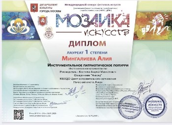 Поздравляем Мингалиеву Алию (объединение "Аккорд", педагог Костарев А. М.) с Дипломом лауреата 1 степени во в Международном конкурсе - фестивале искусств "Мозаика искусств".
